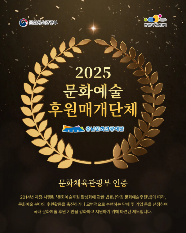 [충청뉴스큐] 충남문화관광재단이 문화체육관광부가 주관하고 한국문화예술위원회가 운영하는 ‘2025년도 문화예술후원매개단체 인증제도’에서 신규 인증기관으로 선정됐다.
