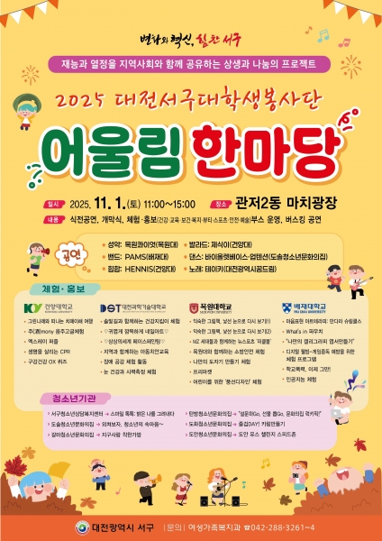 [충청뉴스큐] 대전 서구는 오는 11월 1일 관저2동 마치광장에서 ‘대전서구대학생봉사단 어울림한마당’ 행사를 개최한다.