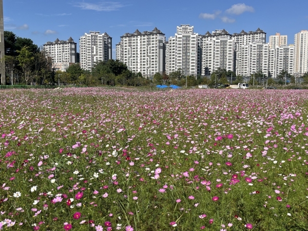 [충청뉴스큐] 대전 서구가 도안동 131-1 일원 갑천 친수구역 유휴부지를 활용해 조성한 꽃 정원에 코스모스가 만개했다.