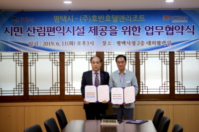 [충청뉴스큐] 평택시가 지난 11일 평택시청 대외협력실에서 ㈜호반호텔앤리조트, 덕평공룡수목원과 평택시민의 산림편익시설 제공을 위한 업무협약식을 가졌다.