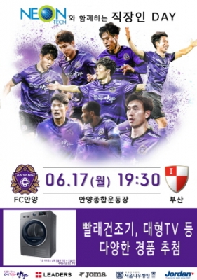 [충청뉴스큐] ‘시민과 함께하는 100년 구단’ FC안양이 올 시즌 첫 번째로 진행되는 월요일 홈 경기를 ‘직장인 DAY’로 치른다. FC안양은 오는 17일 오후 7시 30분, 안양종합운동장에서 진행되는 부산아이파크와의 홈 경기를 ‘직장인 DAY’로 지정하고 직장인을 대상으로 한 이벤트와 프로모션, 그리고 경품 추첨 이벤트를 진행한다.