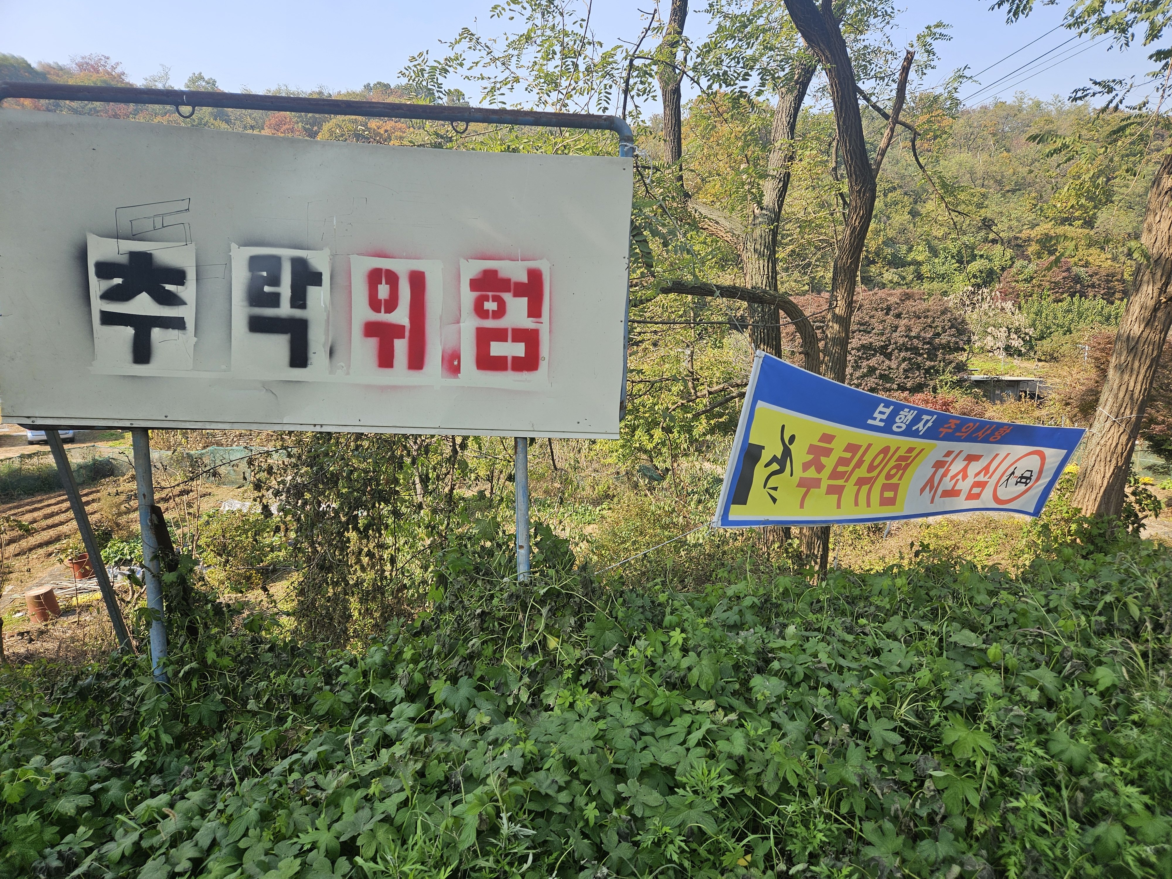 현재 이곳에는 주민이 자비로 설치한 ‘추락 위험’안내 철제 간판과 현수막이 게시되어 있으며 수풀이 우거져 도로 아래 절벽이 쉽게 보이지 않아 사고 위험성이 더욱 높은 상황이다.