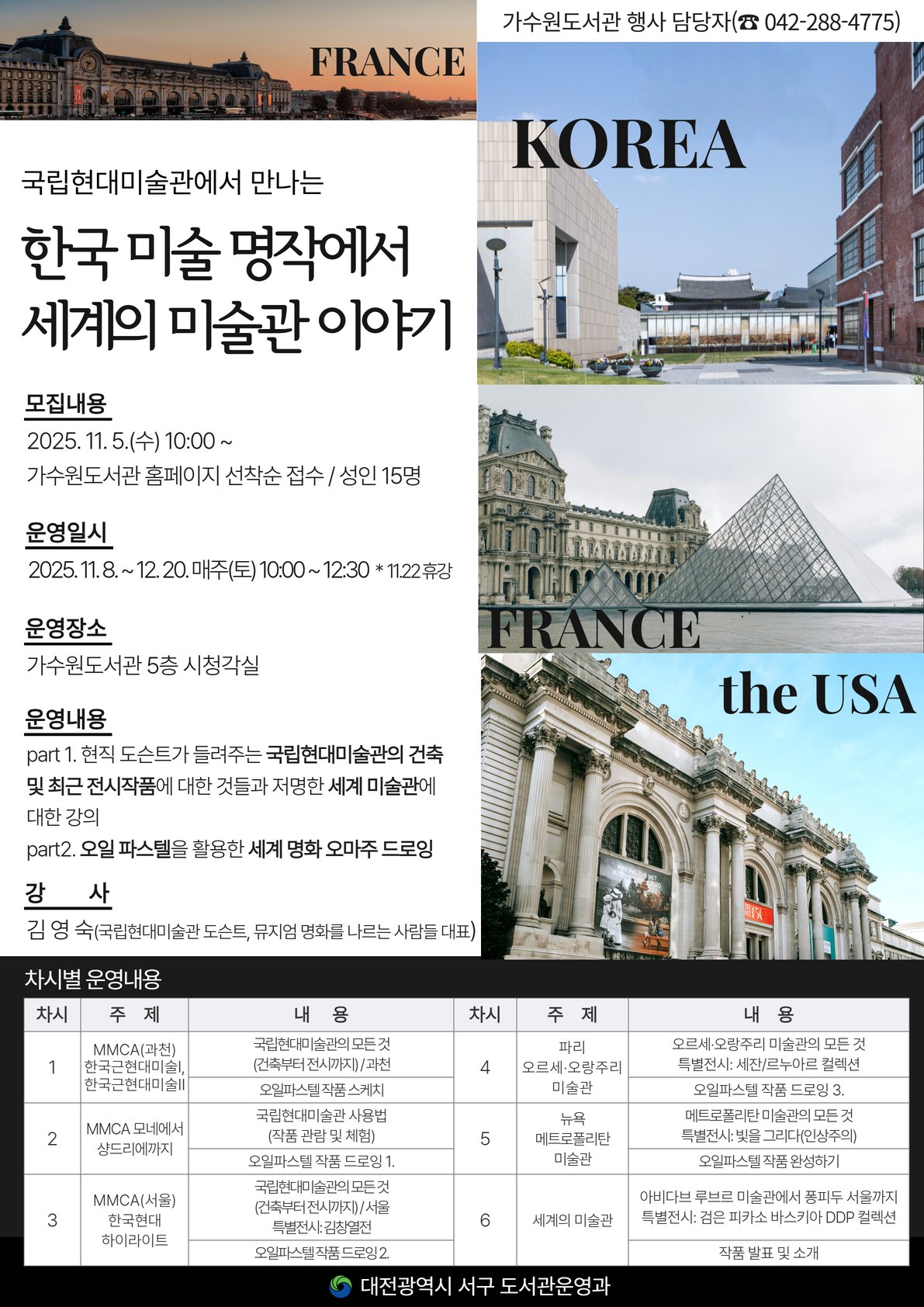 [충청뉴스큐] 대전 서구 가수원도서관은 주민들을 대상으로 ‘국립현대미술관에서 만나는 한국 미술 명작에서 세계의 미술관 이야기’프로그램을 운영한다.