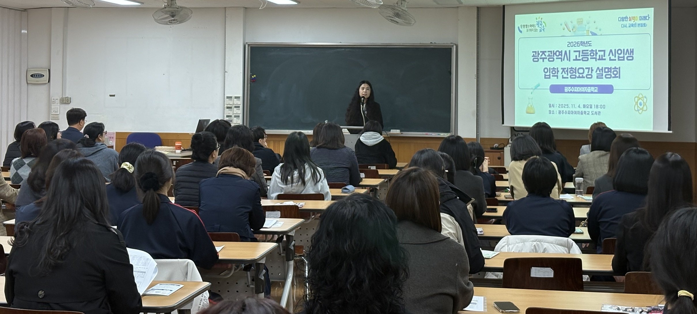 입학 전형 요강 설명회에서는 서진리 교사가 2026학년도 광주지역 고등학교 신입생 입학 전형, 전기고 입시 내용을 설명했다.