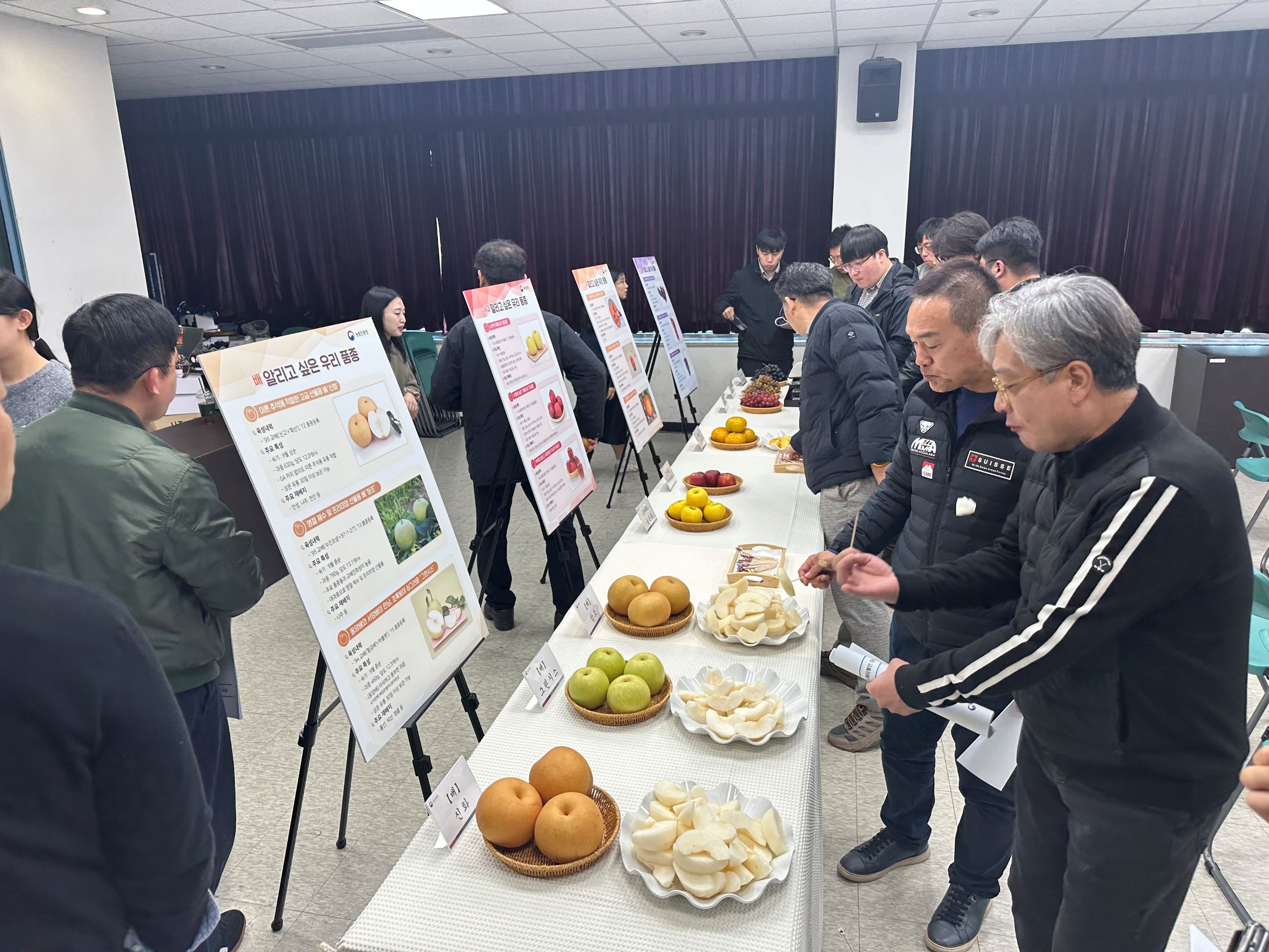 참석자들은 품종별 숙기, 당도, 저장성 등 주요 특징과 출하시기, 포장재 등 유통 정보를 안내받고 신품종을 직접 시식하며 품평을 진행했다.