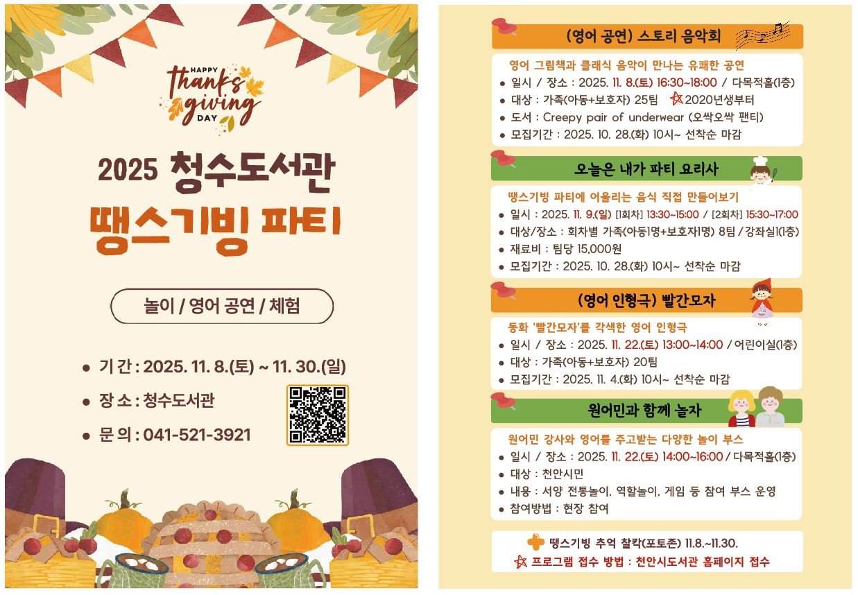 [충청뉴스큐] 천안시 청수도서관은 오는 8~ 30일 ‘2025 땡스기빙 파티’를 연다고 6일 밝혔다.