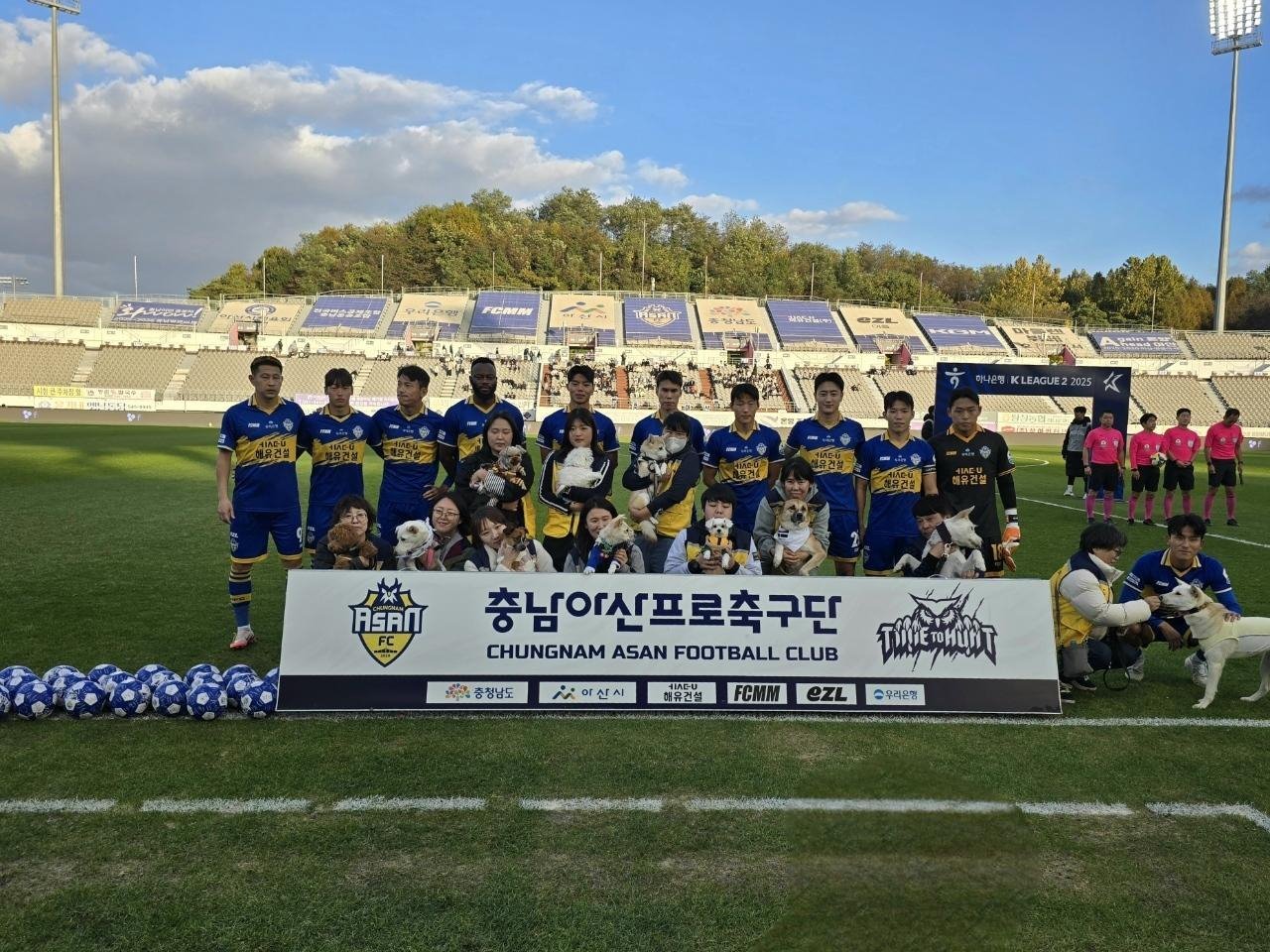 [충청뉴스큐] 아산시는 2일 이순신종합운동장에서 열린 충남아산FC 홈경기에서 아산시동물복지지원센터 ‘온봄’을 통해 반려동물을 입양한 가족 11명을 초청해 선수단과 함께 입장하는 특별 에스코트 행사를 진행했다.