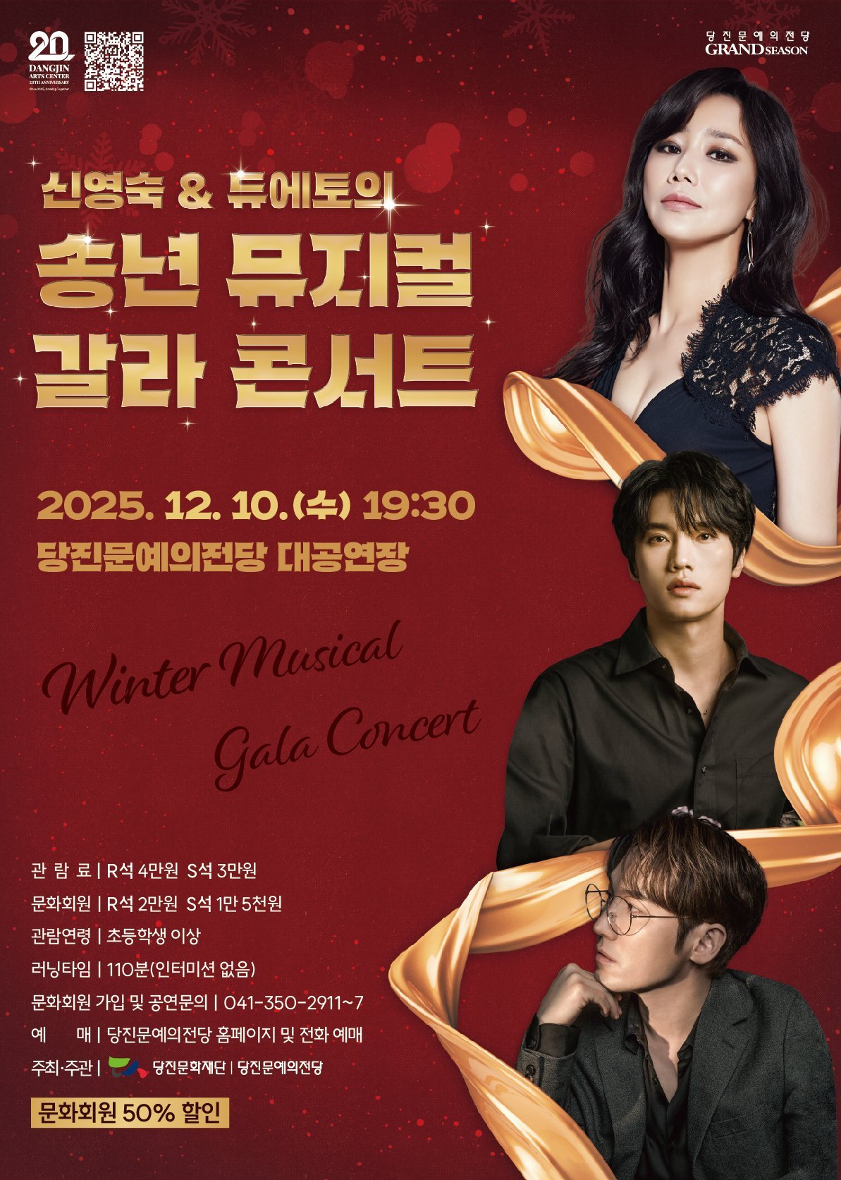 [충청뉴스큐] 당진문화재단·당진문예의전당은 당진문예의전당 개관 20주년을 기념해 특별 기획공연 ‘신영숙 & 듀에토의 송년 뮤지컬 갈라 콘서트’를 오는 12월 10일 오후 7시 30분, 당진문예의전당 대공연장에서 선보인다.