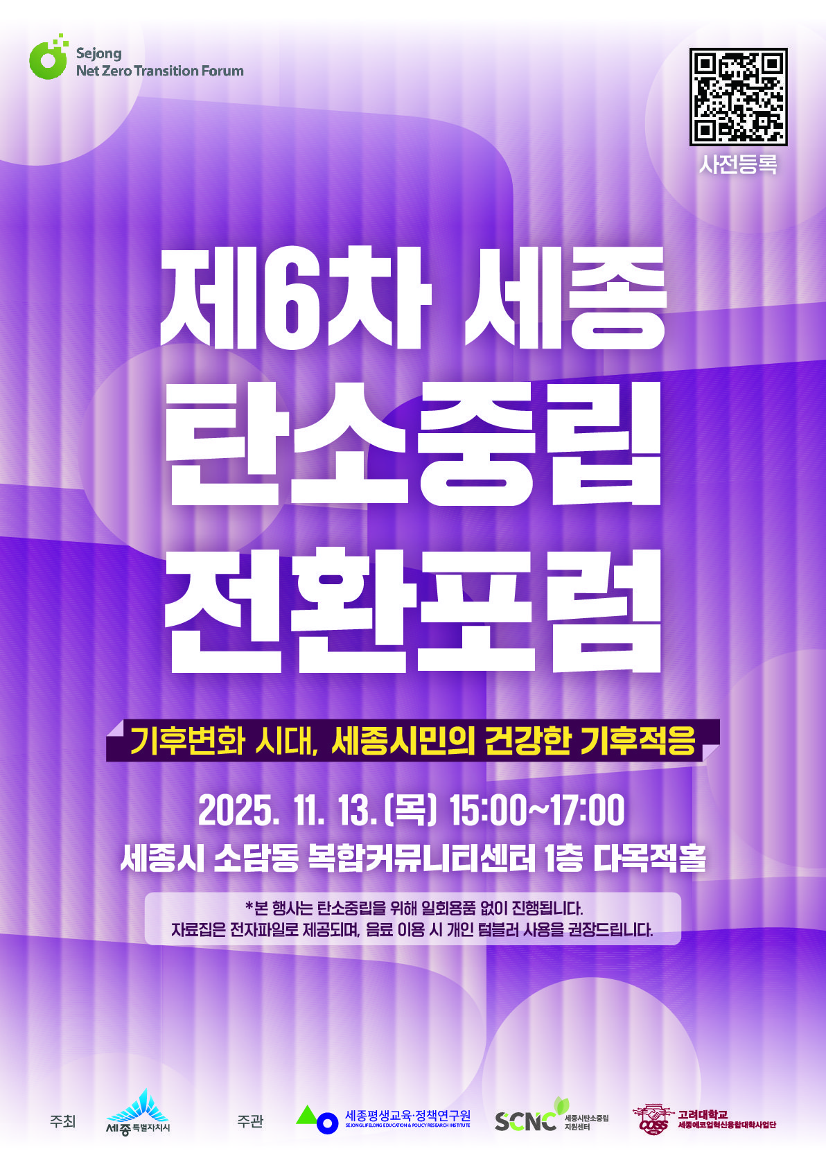 [충청뉴스큐] 세종시가 오는 13일 소담동 행복누림터 다목적홀에서 ‘제6차 세종탄소중립전환포럼’을 개최한다고 밝혔다.