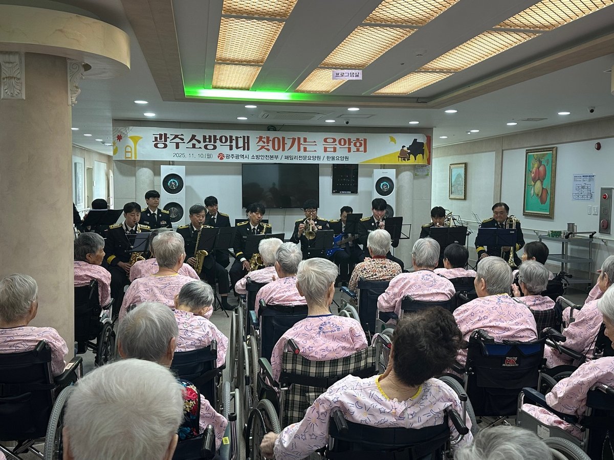 [충청뉴스큐] 광주광역시 소방안전본부는 10일 북구 생용동 패밀리전문요양원·한울요양원에서 ‘광주소방악대 찾아가는 음악회’를 열고 어르신들에게 따뜻한 위로와 감동을 전했다.