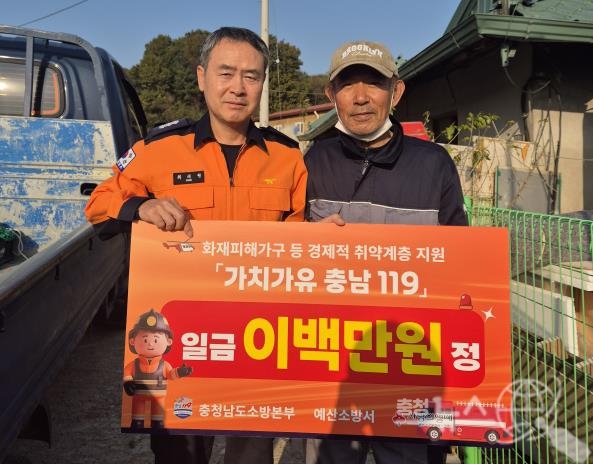 예산소방서와 충청남도소방본부는 최근 화재로 인하여 경제적 어려움을 겪고 있는 취약계층에 성금 200만 원을 전달하며, ‘가치가유 충남119’사업을 통해 이웃사랑을 실천했다.