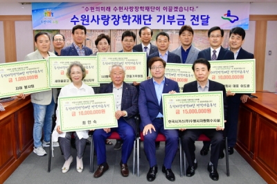 [충청뉴스큐] 한국시거스·늘사랑나눔회을 비롯한 수원시 관내 기업·단체·개인이 14일 시청 상황실에서 수원사랑장학재단에 장학 기금 4300만 원을 전달했다.
