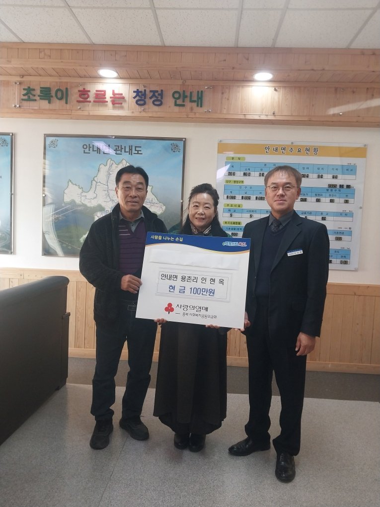 [충청뉴스큐] 옥천군 안내면 용촌리에 사는 마을주민 인현옥씨가 13일 안내면장실에서 ‘이웃돕기 성금 기탁식’을 갖고 성금 100만원을 충북사회복지공동모금회에 전달했다.
