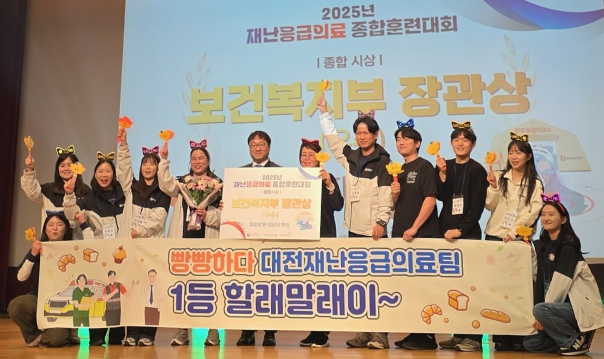[충청뉴스큐] 대전시는 천안 JEI재능교육연수원에서 열린 보건복지부 주최 2025년 재난응급의료 종합훈련대회에서 전국 종합 2위를 차지하며 보건복지부 장관상을 수상했다.