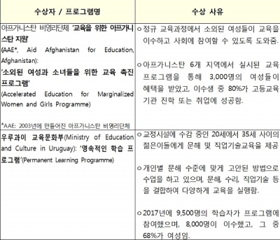 [충청뉴스Q] 2018년 ‘유네스코 세종대왕 문해상’의 수상 단체로 아프가니스탄 비영리단체인 ‘교육을 위한 아프가니스탄 지원’과 우루과이 교육문화부이 선정됐다.
