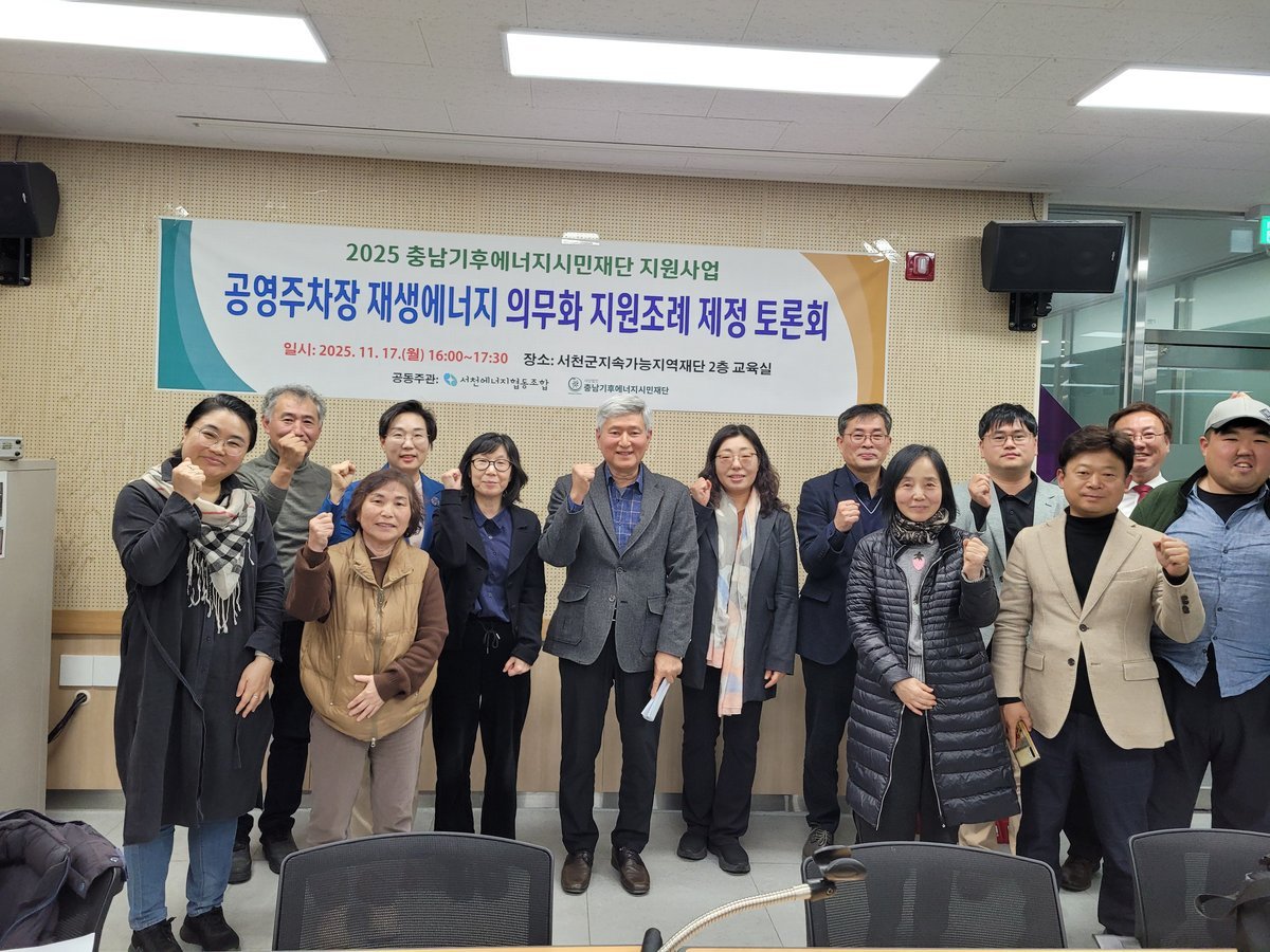 한편 이번 토론회에서는 공영주차장 재생에너지 의무화의 법적 의미, 충남도 조례 추진사례, 지역 협동조합의 역할 등 다양한 논의가 이루어졌으며 참석자들은 서천군의 적극적인 조례 제정 필요성에 공감를 형성했다.