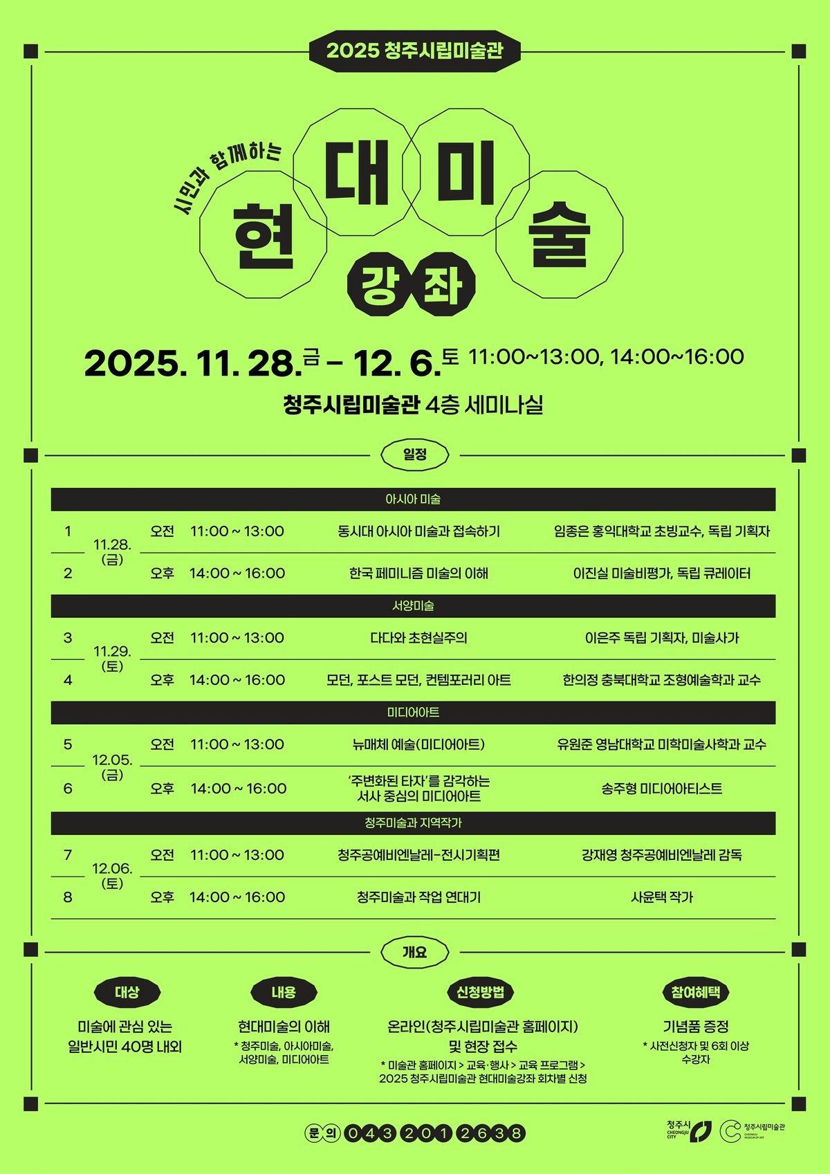 이번 강좌는 현대미술이 어렵게 느껴지는 시민들도 부담 없이 수강할 수 있도록 구성했으며 아시아미술, 한국 페미니즘 미술, 서양미술, 미디어아트, 청주미술 등 다양한 분야에서 활발한 활동을 펼치는 전문가들이 총출동해 8회 강연을 진행한다.