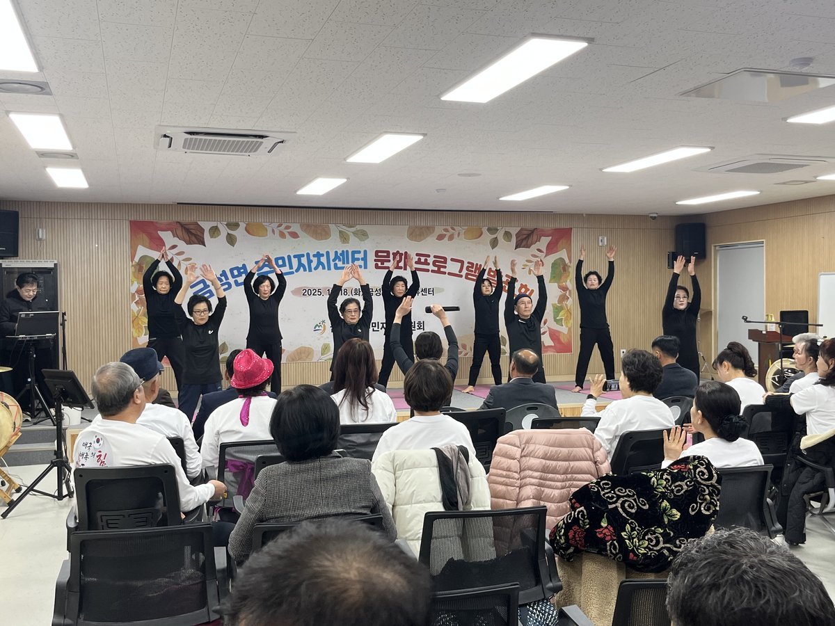노래교실과 버들이장구팀은 밝고 경쾌한 무대로 현장의 분위기를 한층 끌어올렸고 요가 프로그램은 잔잔하고 안정된 퍼포먼스로 주민들의 관심을 모았으며 멧돌체조팀은 활기찬 공연으로 건강한 에너지를 전했다.
