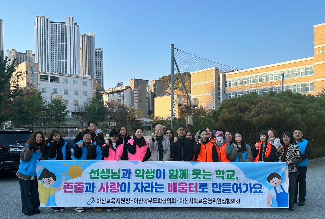 이번 활동은 안전한 통학 환경 조성과 더불어 건전한 학교문화 형성을 위해 아산교육지원청과 두 협의회 관계자 20여명이 참여해 학생들의 안전한 보행을 안내하고 학교폭력 예방 홍보와 교권 존중 메시지 확산에 힘을 보탰다.