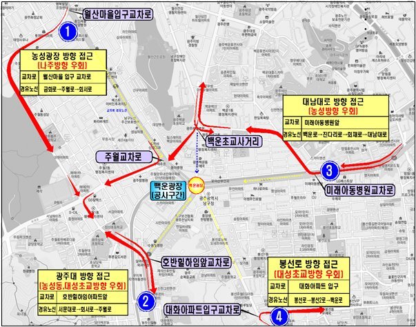 통제 구간 차량 우회도로는 △농성교차로에서 백운광장 방향 → 월산마을 입구 교차로에서 양궁장 방향 △광주대에서 백운광장 → 호반힐하임 교차로에서 양궁장 방향 △남광주에서 백운광장 → 미래아동병원 교차로에서 기독병원 방향 △봉선동에서 백운광장 방향 → 대화아파트 입구 교차로에서 봉선중앙로 방향 등이다.