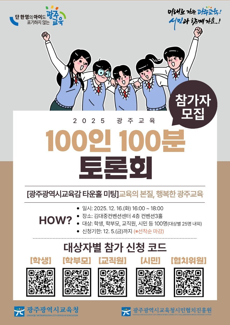 [충청뉴스큐] 광주시교육청시민협치진흥원은 오는 12월 16일 김대중컨벤션센터 4층 컨벤션홀에서 ‘2025 광주교육 100인 100분 토론회’를 개최한다.