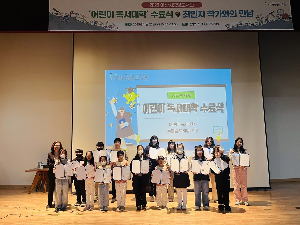 [충청뉴스큐] 아산시 중앙도서관은 22일 ‘2025년 제9회 어린이 독서대학 수료식’을 개최했다고 밝혔다.
