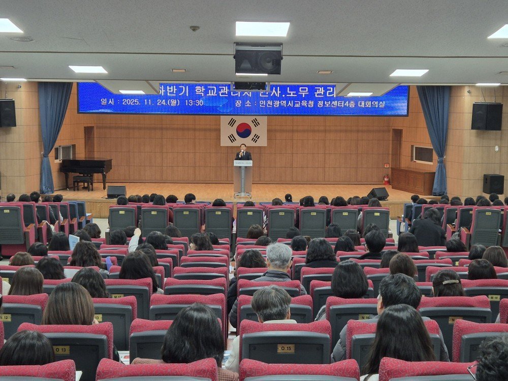 [충청뉴스큐] 인천광역시교육청은 24일 정보센터 4층 대회의실에서 공립 각급학교 행정실장 500여 명을 대상으로 ‘2025년도 하반기 학교관리자 인사‧노무 관리 연수’를 실시했다.