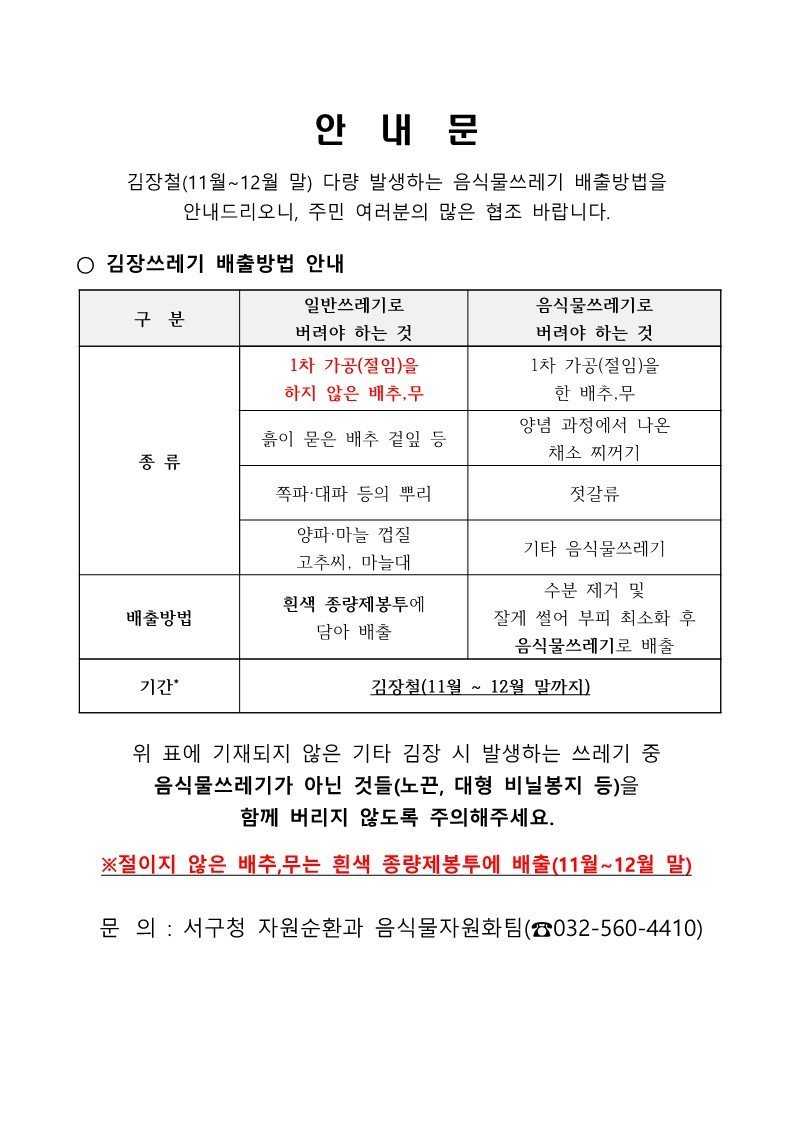 [충청뉴스큐] 인천 서구는 김장철 ‘김장쓰레기’를 원활히 처리하기 위해 11월부터 12월 말까지 한시적으로 일부 김장쓰레기에 대하여서만 생활폐기물 일반 규격 봉투 배출을 허용한다.
