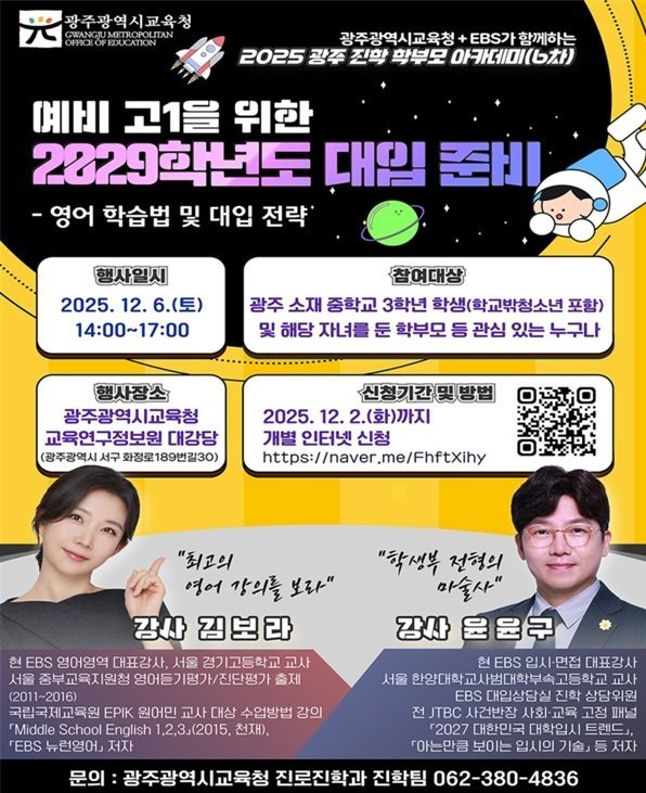 [포스터] 광주시교육청이 오는 6일 오후 2시 광주시교육청교육연구정보원 대강당에서 올해 마지막 ‘광주진학 학부모 아카데미’를 개최한다.