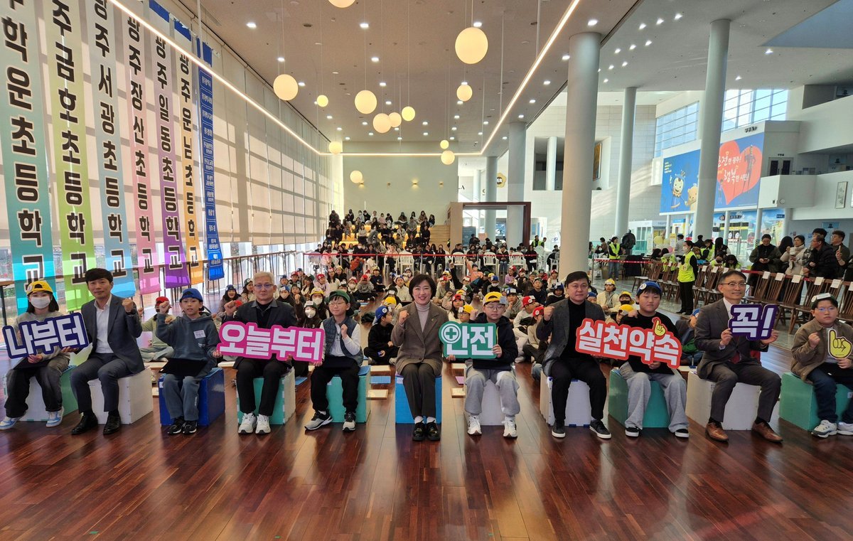 안전실천 다짐대회에서는 어린이 6명이 참석자 대표로 무대에 올라 ‘우선 멈춤 예스’, ‘무단횡단 노’ 등 문구를 담은 안전 실천 선서문을 낭독했다.
