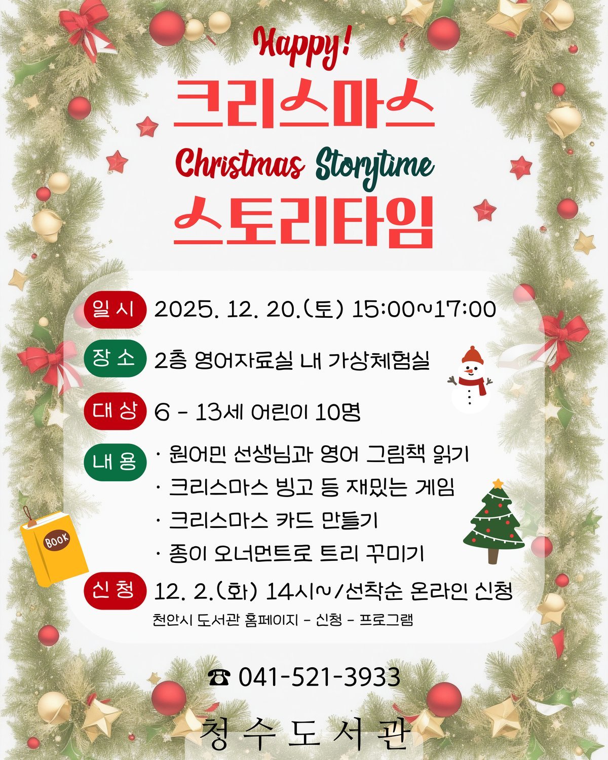유정희 청수도서관장은 “이번 프로그램을 통해 아이들이 자연스럽게 영어를 접하고, 따뜻한 연말의 추억을 쌓는 시간이 되기를 바란다”고 말했다.