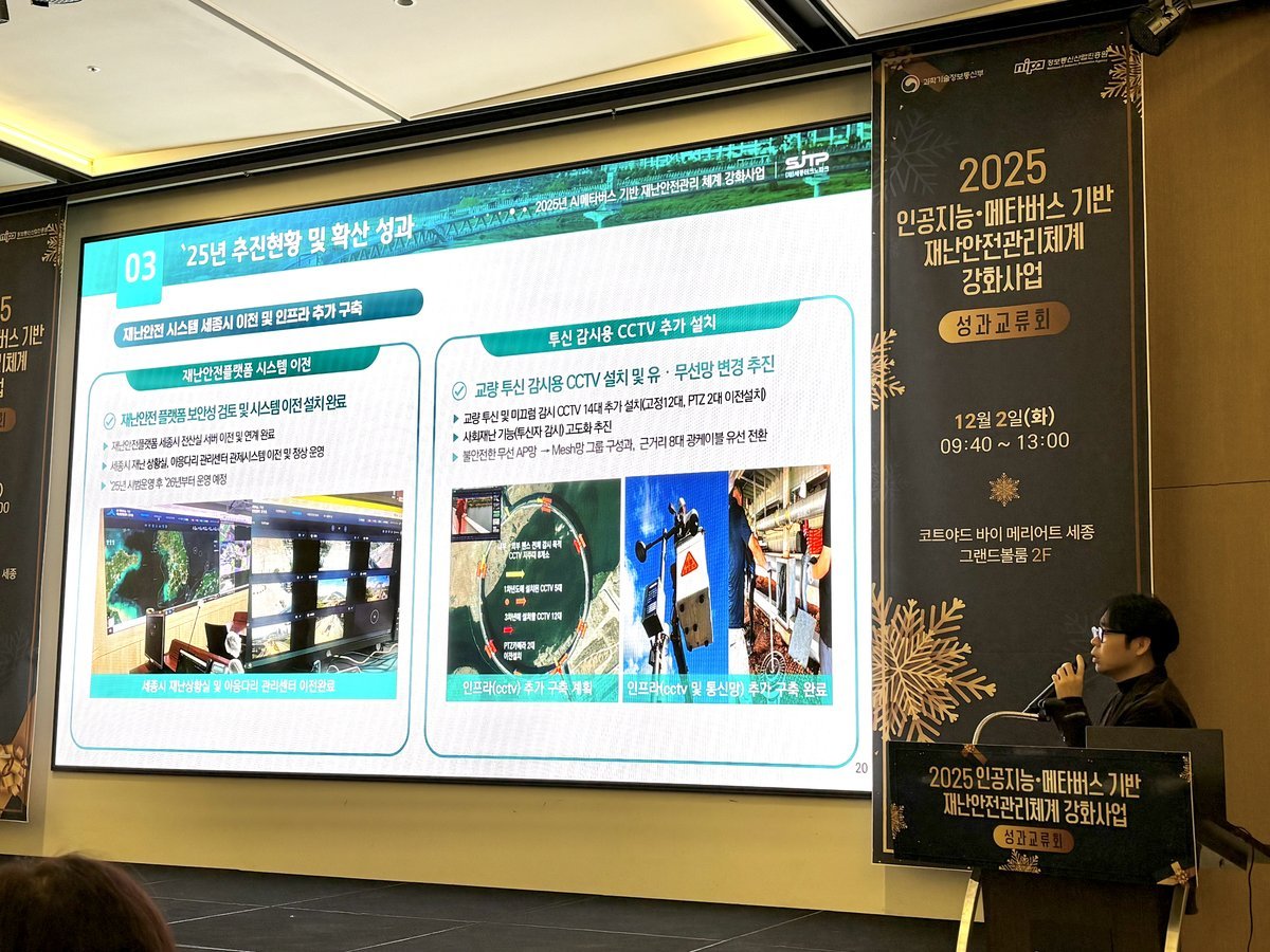 [충청뉴스큐] 세종특별자치시가 2일 코트야드바이메리어트세종에서 열린 ‘2025년 인공지능·메타버스 기반 재난안전관리체계 강화사업 성과교류회’에서 인공지능 기반 재난안전관리 구축 사례를 공유했다.