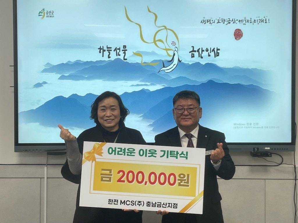 이기영 금산읍장은 “한전 엠씨에스 금산지점의 따뜻한 관심과 지원에 감사드린다”며 “기탁금은 지역 주민들의 삶의 질 향상에 기여할 수 있도록 잘 활용하겠다”고 밝혔다.