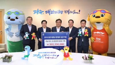 광주광역시와 2019광주세계수영선수권대회조직위원회는 18일 오전 시청 3층 접견실에서 전남시장·군수협의회와 3억300만원 상당 입장권 구매증서 전달식을 가진데 이어, 광주시 배구협회와도 1000만원 상당 입장권 구매증서 전달식을 가졌다.