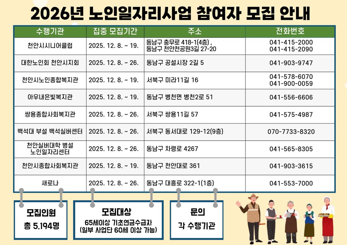 노인일자리사업은 천안시시니어클럽, 대한노인회 천안시지회, 천안시 노인종합복지관, 아우내은빛복지관, 쌍용종합사회복지관, 백석대 부설 백석실버센터, 천안실버대학 병설 노인일자리센터, 천안시종합사회복지관, 새로나 총 9개 기관에서 추진한다.