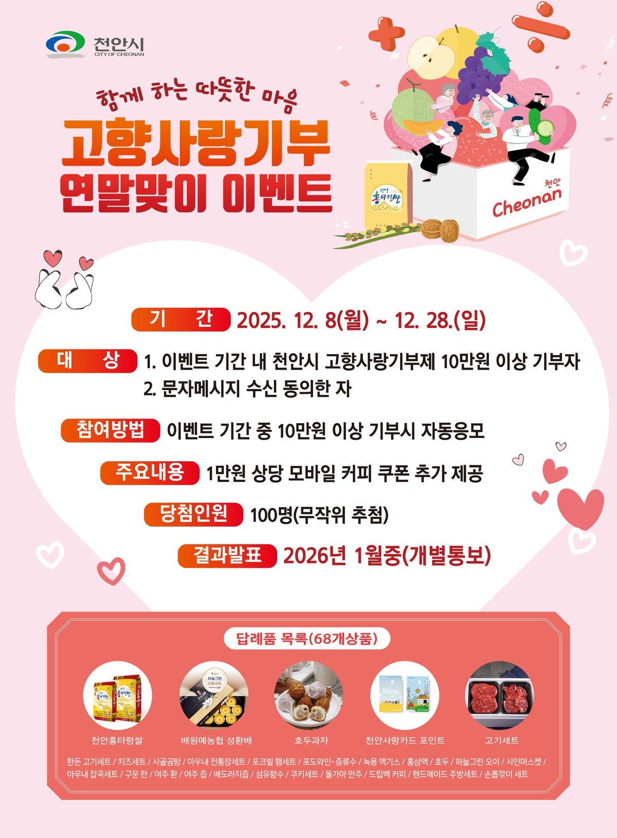 [충청뉴스큐] 천안시는 오는 28일까지 ‘고향사랑기부제 연말맞이 이벤트’를 진행한다고 8일 밝혔다.