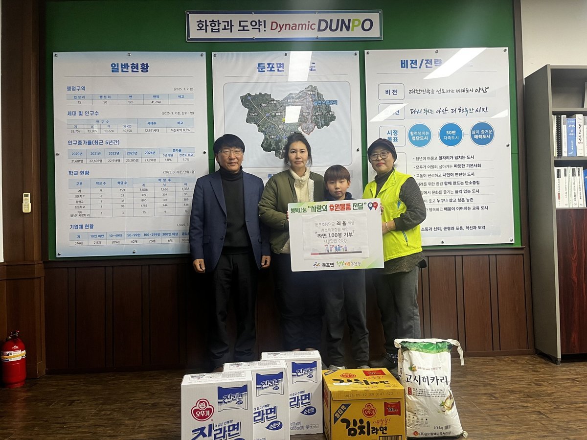 [충청뉴스큐] 아산시 둔포면 행정복지센터에 둔포초등학교 5학년 최율 어린이가 15만 원 상당의 쌀과 라면을 기부하여 지역사회에 따뜻한 나눔을 실천했다.