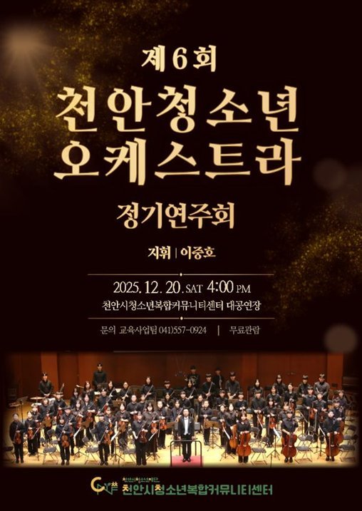 정기연주회는 무료 관람으로 진행되며, 관련 문의는 천안시청소년복합커뮤니티센터 누리집 또는 교육사업팀으로 하면 된다.