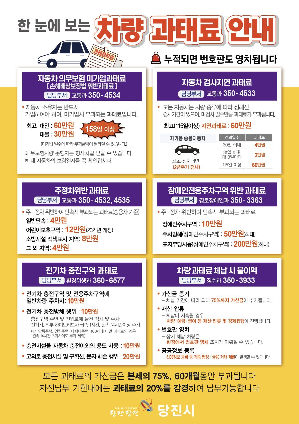 [충청뉴스큐] 당진시는 차량 관련 과태료 정보를 한눈에 확인할 수 있는‘차량 과태료 통합 안내문’을 제작해 관내 아파트 단지와 각 행정복지센터에 비치했다고 15일 밝혔다.