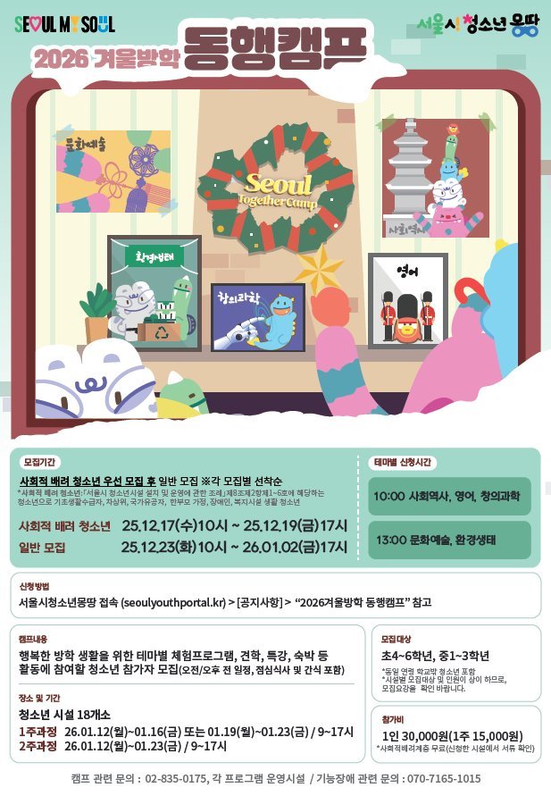 [충청뉴스큐] 서울시가 다가오는 겨울방학을 맞아 청소년들의 돌봄 공백을 해소하고 진로 탐색의 기회를 제공하는 ‘서울시 청소년 동행캠프’를 추진한다고 밝혔다. 이번 캠프는 2026년 1월 12일부터 23일까지 2주간 서울시립청소년시설 24개소에서 진행된다.