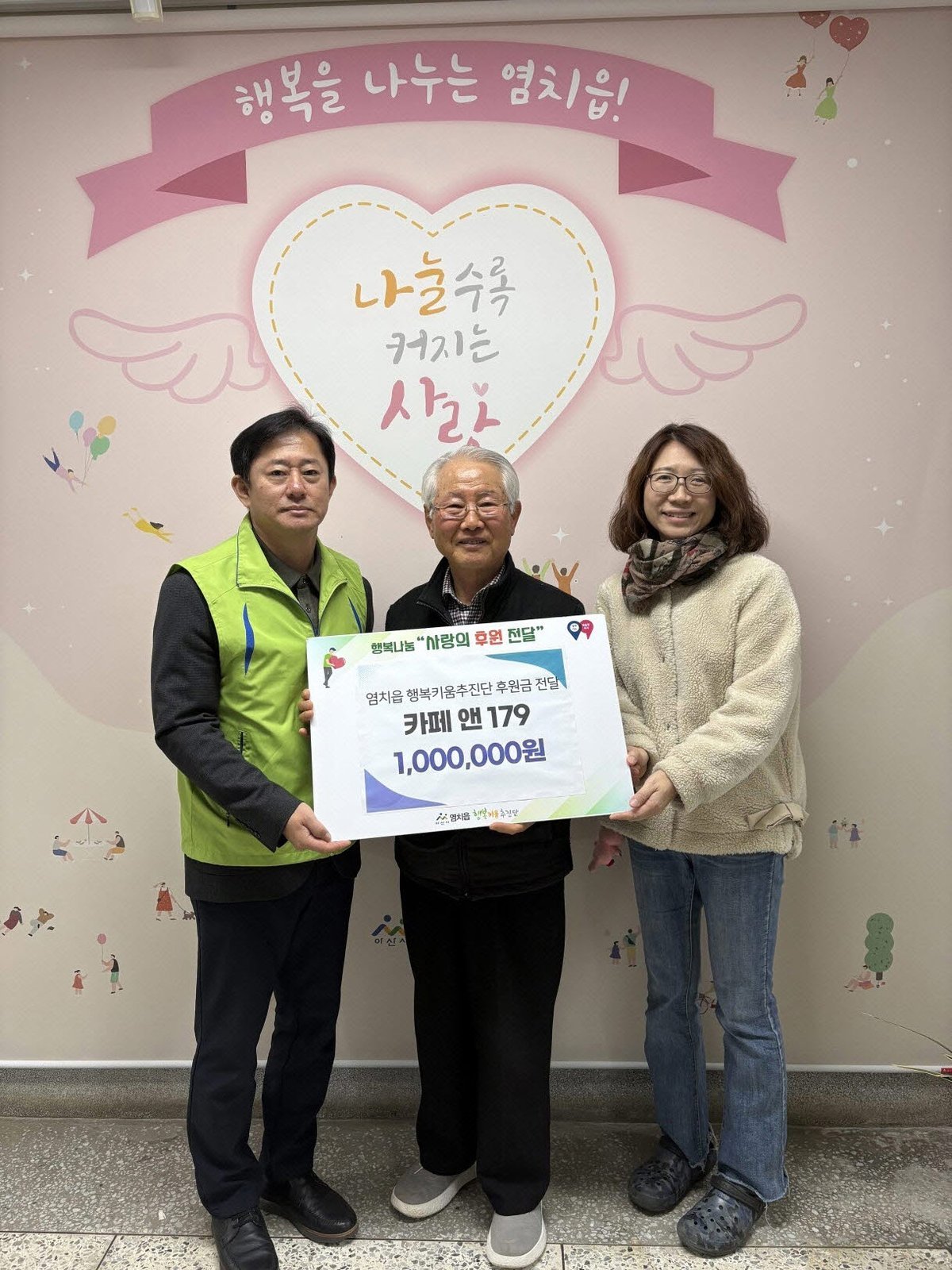 [충청뉴스큐] 아산시 염치읍에 위치한 카페앤179은 지난 15일 염치읍 행정복지센터에서 염치읍 행복키움추진단에 후원금 100만 원을 전달하며 지역사회 이웃사랑 실천에 동참했다.