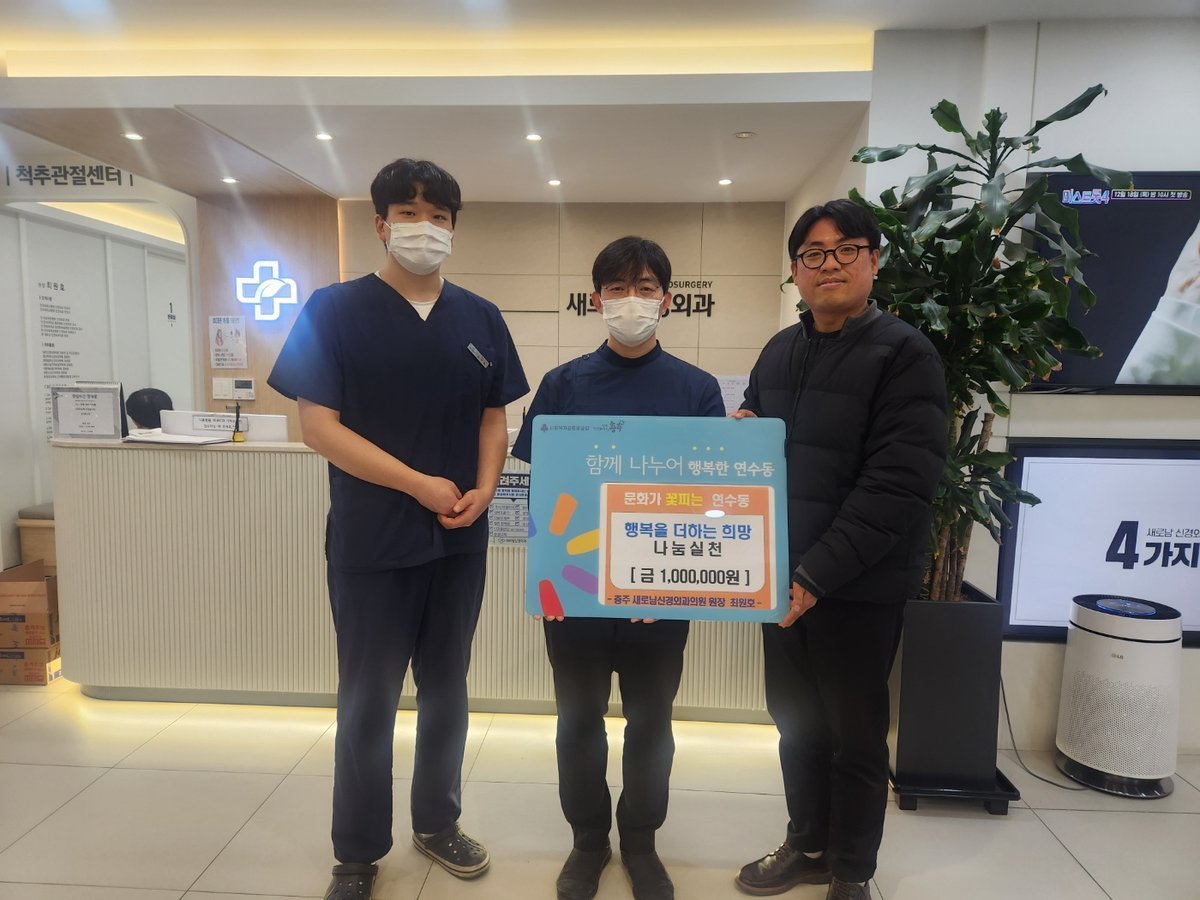 충주새로남신경외과의원은 연말을 맞이해 이웃사랑 성금 100만 원을 연수동행정복지센터에 기탁했다고 밝혔다.