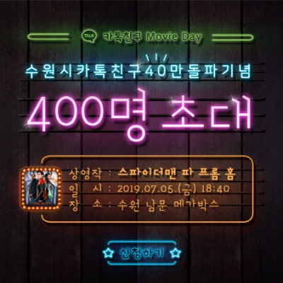[충청뉴스큐] 수원시가 카카오톡 플러스친구 40만 명 돌파를 기념해 ‘카톡친구’에게 영화관람 기회를 주는 ‘수원시 카톡친구 무비데이’ 이벤트를 연다.