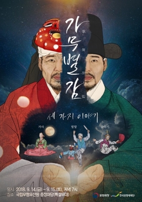 〈가무별감, 세 가지 이야기〉는 국가긴급보호무형문화재 세 종목인 가사, 발탈, 줄타기를 하나의 극 형식으로 만든 특별한 전통공연이다. 이야기가 있는 극으로 만들어졌지만 각 종목의 특색이 고스란히 살아있어 한자리에서 만나기 힘든 세 종목의 진정성 있는 공연을 함께 관람할 수 있다.