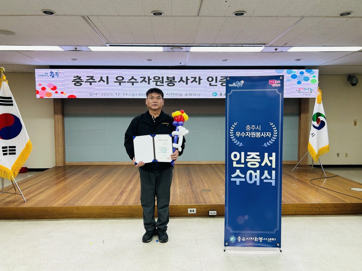 [충청뉴스큐] 현대엘리베이터 현대누리보듬봉사단 유성곤 단장은 지난 19일 시청 10층 중회의실에서 열린 충주시자원봉사센터 주관 ‘충주시 우수자원봉사자 인증서 수여식’에서 자원봉사 누적 3000시간 인증서와 인증뱃지를 수여받았다.
