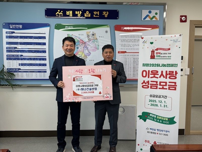 강한용 배방읍장은 “희망2026 나눔캠페인에 동참해 주신 ㈜하나건설산업에 진심으로 감사드린다”며 “기탁된 성금은 지역 내 도움이 필요한 이웃들을 위해 소중히 사용하겠다”고 전했다.