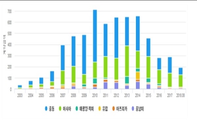 저유가 등으로 중동에서의 수주가 줄면서 지난 7천억 달러 수주 이후로는 아시아에서의 수주가 중동보다 많았고, 누적 기준으로도 중동의 수주 비중은 1.7%p 하락하고, 아시아는 1.9%p 상승하는 양상이 나타났다.