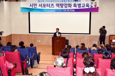 광주광역시는 20일 오후 시청 2층 무등홀에서 시민 서포터즈와 광주청년위원회, 시·조직위 소셜기자단, 광주빛고을청년봉사단, 오매광주 문화관광 소셜기자단 등 140여명이 참석한 가운데 ‘2019광주세계수영선수권대회 시민 서포터즈 역량강화 특별교육’을 개최했다.