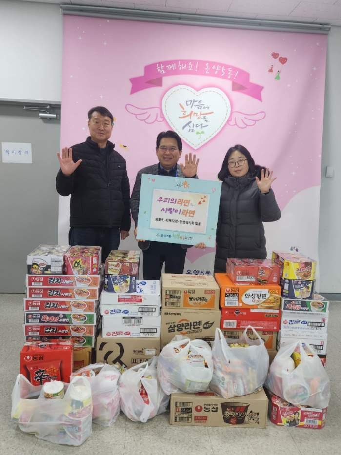 [충청뉴스큐] 용화초등학교 학부모회와 운영위원회는‘우리의 라면이 사랑이 라면’이라는 제목으로 학부모와 학생들이 자발적으로 참여해 모은 라면을 26일 아산시 온양5동 행복키움추진단에 전달하며 이웃 사랑을 실천했다.