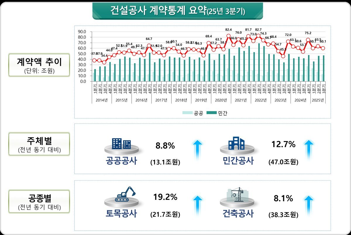 [충청뉴스큐] 국토교통부는 ’25년 3분기 건설공사 계약액이 전년 동기 대비 11.9% 증가한 60.1조 원을 기록하였다고 밝혔다.